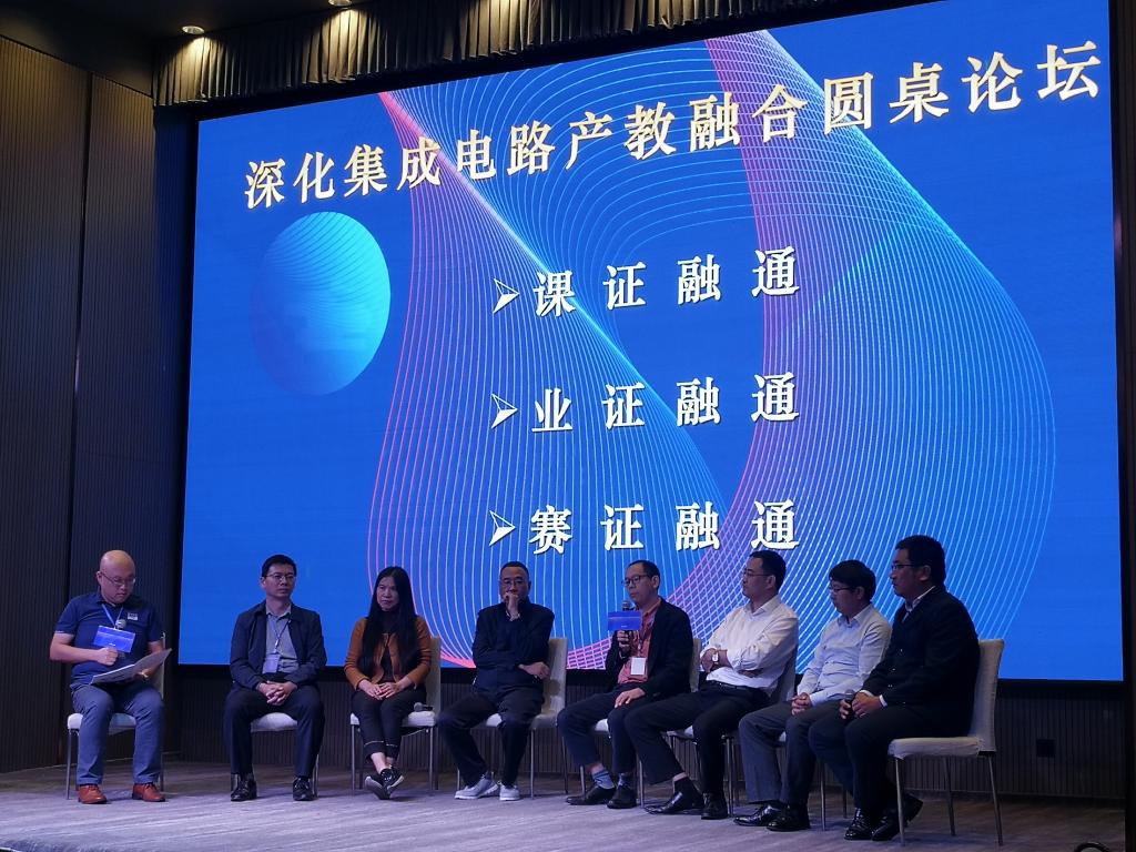 在围绕“课证融通、业证融通、赛证融通”展开的“深化集成电路产教融合圆桌论坛”环节,陈良院长再次受邀上场与主持嘉宾互动,提出了“书证融通”的可行性路径:将模块课程整体内容和1+X技能等级证书进行匹配融合。
