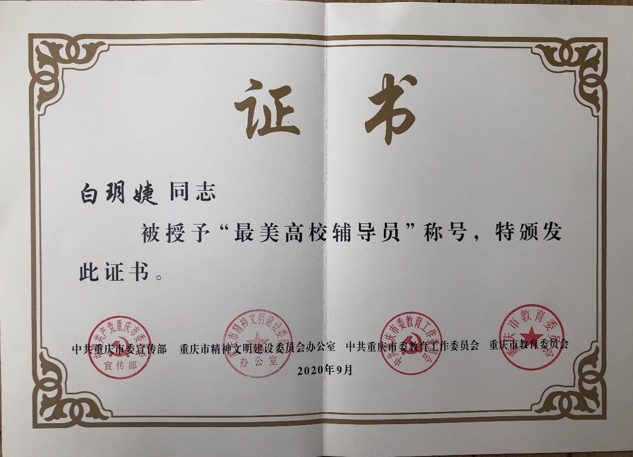 为大力培养选树新时代高校辅导员先进典型,激发广大辅导员的荣誉感、责任感、使命感,根据市委教育工委、市教委印发的《关于开展重庆市最美高校辅导员学习宣传活动的通知》文件精神,pg国际智能制造与汽车学院教师白玥婕被授予“2020年重庆市最美高校辅导员”称号。
