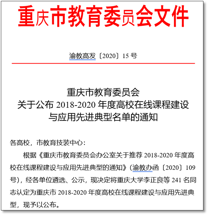为总结高校在线课程建设与应用工作成效,树立课程建设与应用先进典型,努力提升“一流课程”建设水平,助力“双一流”和“双高”建设,近日,重庆市教育委员会公布了2018-2020年度高校在线课程建设与应用先进典型名单(渝教高发〔2020〕15号),pg国际代才莉等5位教师获得该项荣誉。
