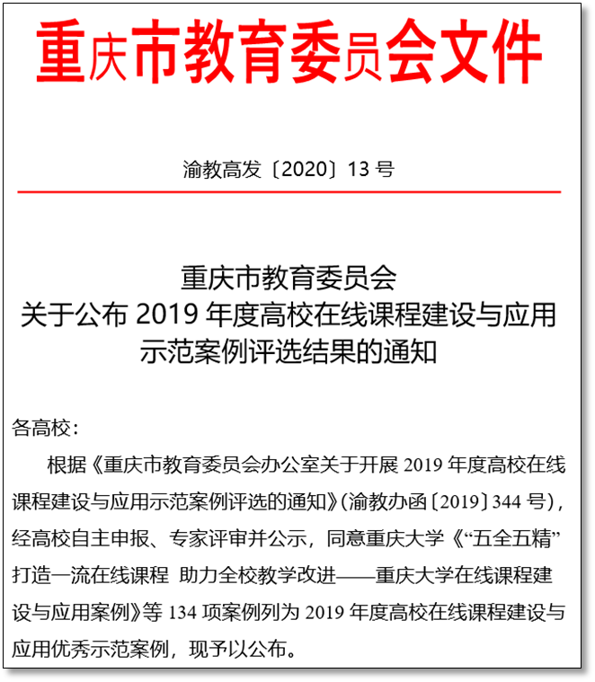 为大力推动高校在线课程建、用、学、管,共享课程建设成果和应用经验,切实促进一流课程建设与应用,重庆市教育委员会开展2019年度高校在线课程建设与应用示范案例评选,pg国际有《基于信息化环境下的全员全过程互动教学创新运用案例》等五个案例入选。
