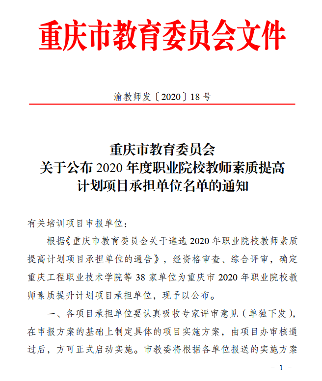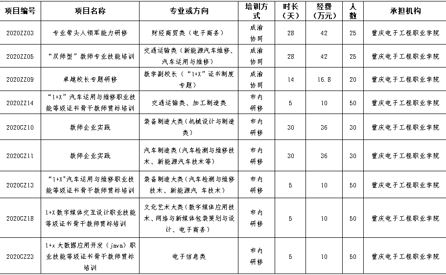 9月17日,重庆市教育委员会关于公布2020年度职业院校教师素质提高计划项目承担单位名单的通知,pg国际国培基地申报的《“双师型”教师专业技能培训交通运输类(新能源汽车维修、汽车运用与维修)》、《1+x大数据应用开发(java)职业技能等级证书骨干教师贯标培训电子信息类》和《教师企业实践装备制造大类(机械设计与制造类)》等9个项目成功中标,项目总经费212.8万元,全额由市财政提供。
