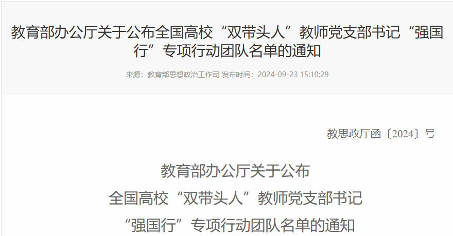 2024年10月15日,教育部思想政治工作司根据《教育部办公厅关于开展高校“双带头人”教师党支部书记“强国行”专项行动的通知》(教思政厅函〔2024〕11号)要求,发布了全国高校“双带头人”教师党支部书记“强国行”专项行动团队名单,pg国际通信工程学院通工与通运党支部张慧敏“双带头人”工作室成功入选。