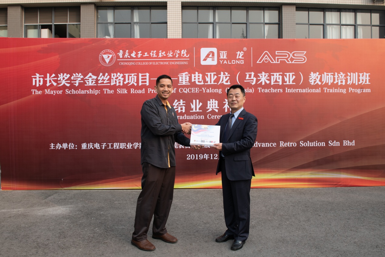 结业典礼上,孙卫平书记对17名来自马来西亚的学员们如期完成学习任务表示祝贺并颁发了进修结业证书。对结业即将踏上归国旅程的17位马来学员寄予厚望:“‘走进重电门,就是重电人’。重电就是你们的第二个母校。无论未来你们身在何处,希望你们能够继续关注母校的发展。回国后,在传播知识的同时,亦能传播中国文化,架起中国与马来西亚友谊的桥梁,成为中马友好交流的使者。”智能制造与汽车学院张进春院长代表学院献上了祝愿,并将承载着满满回忆的纪念相册赠予了全体马来学员。马来教师代表也送上了自己的礼物——一份来自马来西亚青年体育部部长和各马来教师所属单位的联名感谢信,对提供本次培训项目的重庆市教委、以及承办本次培训的重庆电子工程职业学院表示衷心的感谢。