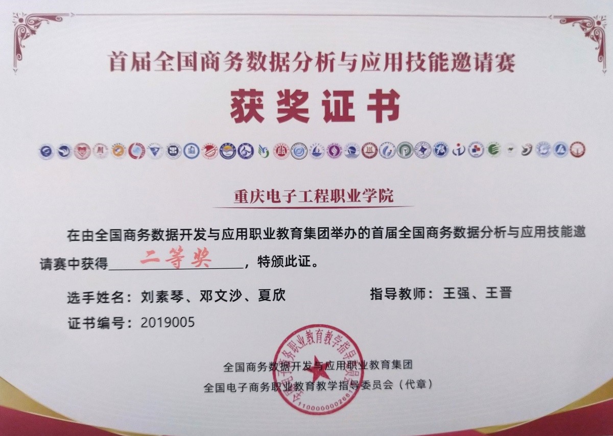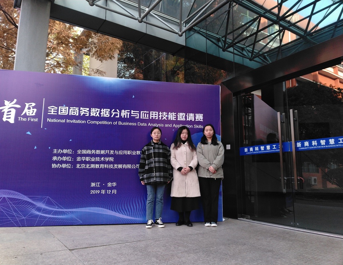 首届全国商务数据分析与应用技能邀请赛于2019年12月7日在浙江金华职业技术学院举行,由财经管理学院数字贸易专业群王强、王晋两位老师指导,电商18级刘素琴、邓文沙、夏欣三位学生组成的团队表现优异,从来自全国近二十个省市不同职业院校组成的31支参赛队中脱颖而出,以总成绩排名第四,二等奖排名第一的成绩,获得二等奖。