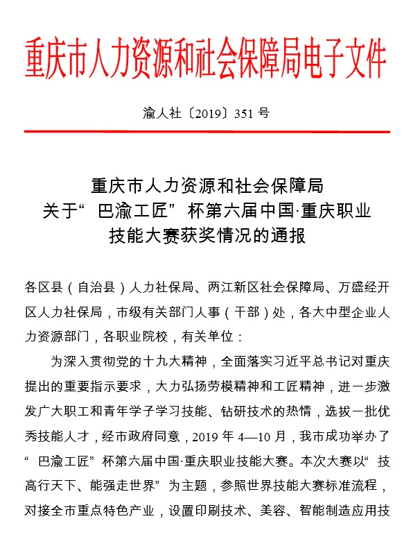 “巴渝工匠”杯第六届中国•重庆职业技能大赛由重庆市政府举办,市委组织部、市委宣传部、市教委、市人力社会局等承办。大赛以“技高行天下、能强走世界”为主题,参照世界技能大赛标准流程,对接全市重点特色产业,设置印刷技术、美容、智能制造应用技术、网络安全、电子技术、火锅、小面、移动机器人等20个竞赛项目,共辐射带动20余万人参加初赛,1600余人进入总决赛,选拔高技能人才3000余名,产生个人奖619名、优秀指导教师98名、优秀组织奖22个,充分展示了全市职业技能发展水平和广大技能人才良好风貌,对大力营造劳动光荣的时代风尚和精益求精敬业风气,推动技能成才和技能报国,起到了积极促进作用。