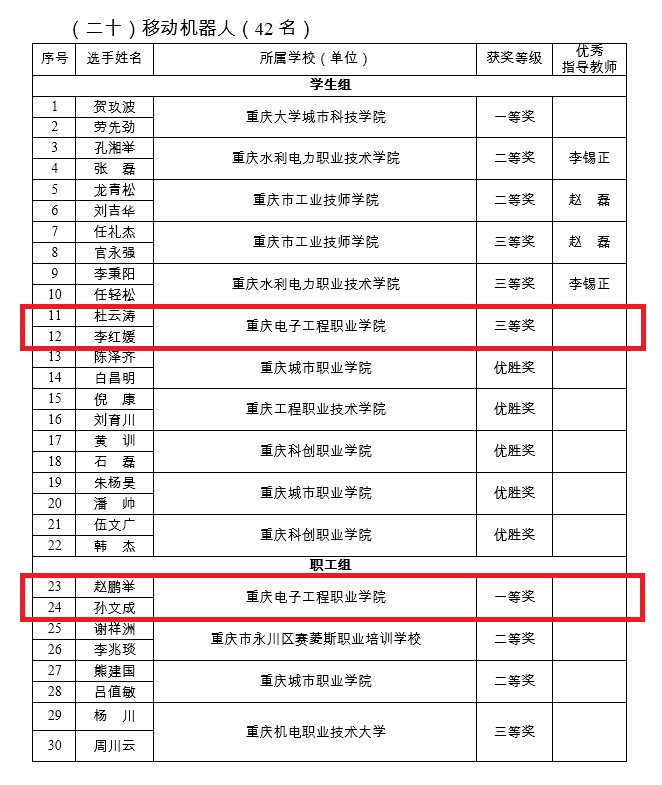 近日,重庆市人力资源和社会保障局公布了“巴渝工匠”杯第六届中国•重庆职业技能大赛获奖情况,智慧健康学院教师赵鹏举、孙文成获得移动机器人项目职工组一等奖,嵌入式技术与应用专业学生杜云涛、李红媛获得移动机器人项目学生组三等奖,并获得了第46届世界技能大赛移动机器人赛项集训资格。