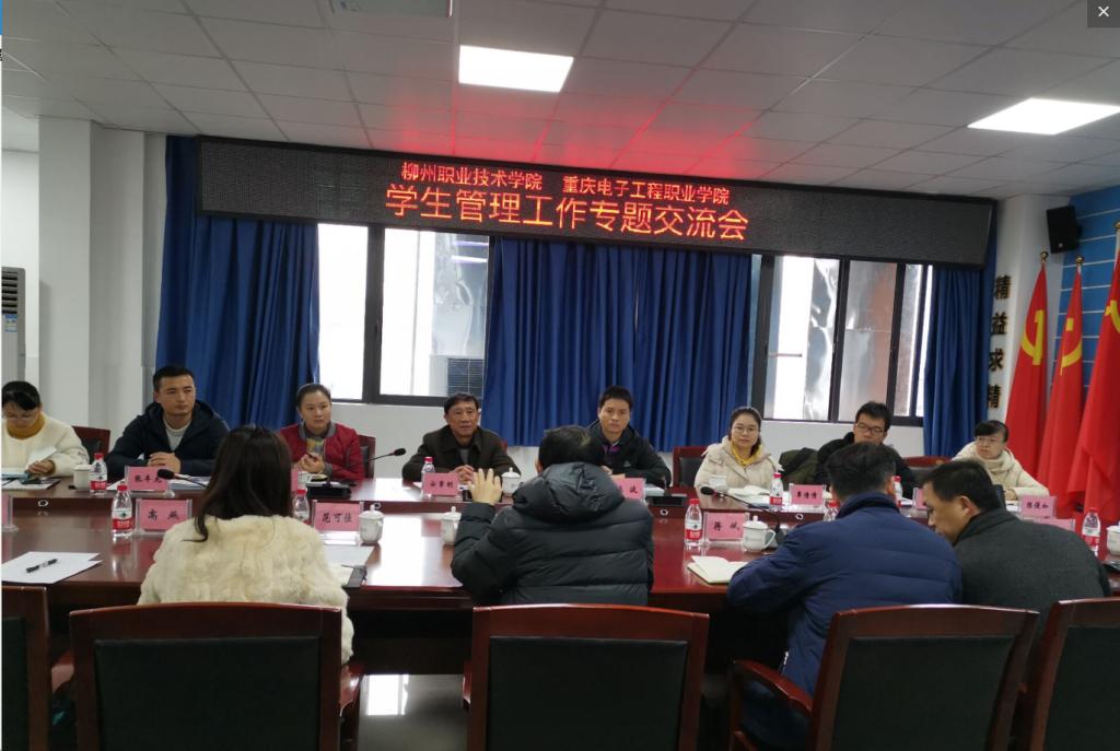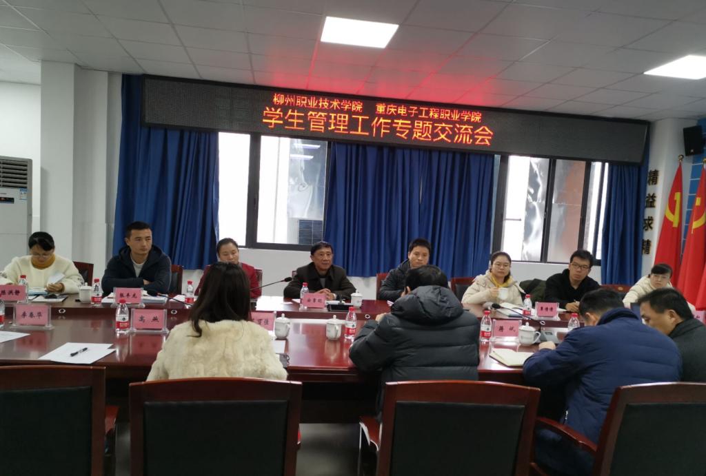 12月5日上午,柳州职业技术学院学生工作处处长安掌明、学生工作处副处长陈波带领学生工作处、辅导员一行来pg国际交流学生管理工作。pg国际党委学工部部长何光明、党委学工部副部长蒋斌、党委学工部综合科、宿管中心负责人、财经管理学院、智能制造与汽车学院辅导员参加了交流座谈会。