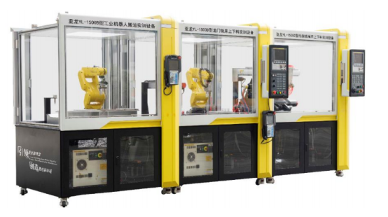 本次大赛采用的是多套亚龙YL-1500 系列智能制造产线实训平台,采用模块化组合,便于组合与拆分,该平台包含硬件与软件两部分,软件部分采用亚龙智能制造管理系统。硬件部分采用亚龙YL-1500B 型工业机器人搬运实训设备(图1)、亚龙 YL-1500D 型龙门铣床上下料实训设备(图 2)、亚龙 YL-1500C型桁架机械手上下料实训设备(图3) 三种设备相结合的结构,三种设备既可以单独训练学习不同的功能,又可以组成智能制造生产线学习完整的产线运行原理。