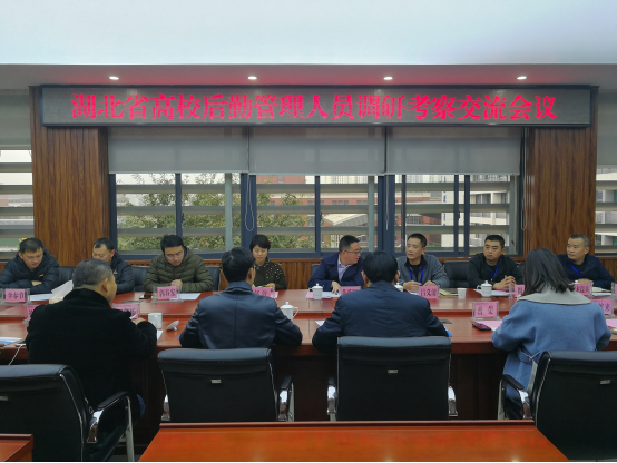 2019年11月20日下午,湖北省高校后勤研究会调研考察团一行十人在武汉理工大学后勤集团王如意副总经理的带领下,来到pg国际调研考察后勤管理工作。湖北省高校后勤研究会调研考察团由武汉理工大学、中南民族大学、武汉纺织大学生、湖北科技学院、湖北职业技术学院等10所湖北本科高职院校后勤领导组成。黄爱明副校长热情接待了湖北高校来宾。