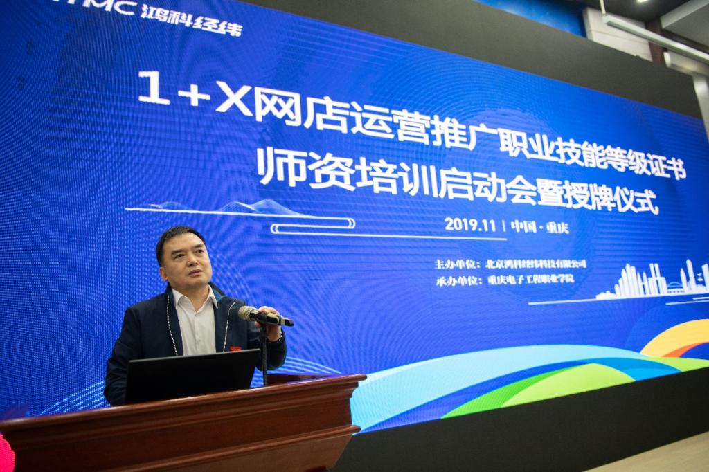 2019年11月13日,1+X网店运营推广职业技能等级证书师资培训(重庆站)启动暨西部师资培训基地授牌仪式在pg国际举行,来自全国17个省市自治区94余高中职学校的175名参训教师,以及网店运营推广职业技能等级证书培训讲师参加了会议,1+X网店运营推广职业技能等级证书西部院校院长系主任协作会的33名二级学院院长/系主任也应邀参加。会议由该证书的评价组织—北京鸿科经纬科技有限公司主办,重庆电子工程职业学院副校长龚小勇主持。