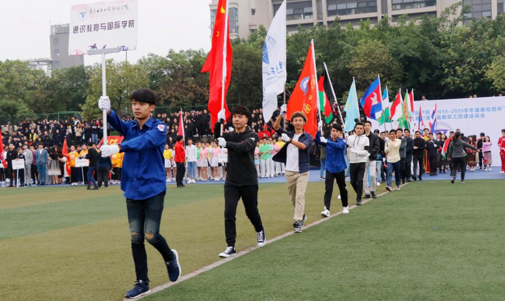 沐浴着初冬的晨风,伴随着激昂的《义勇军进行曲》,全体师生进行了升国旗仪式。在副校长龚小勇宣布开幕式开始后,各二级学院的代表队,伴随着雄壮的运动员进行曲,以精神饱满的状态,迈着矫健的步伐入场。各代表方队结合自身专业特点,以舞蹈,T台秀,专业展示,无人机表演等新颖方式为全校师生带来了不一样的视觉体验。其中来自通识教育学院由11个国家60余名学生组成的留学生方队还给我们带来异域风情舞蹈,充分体现了pg国际积极响应国家一带一路的号召,努力建立中国特色社会主义高水平高职院校的决心。由教职工代表队给我们带来的第九套广播体操,独特的方阵队伍和表演让整个会场进入高潮,现场掌声雷动。