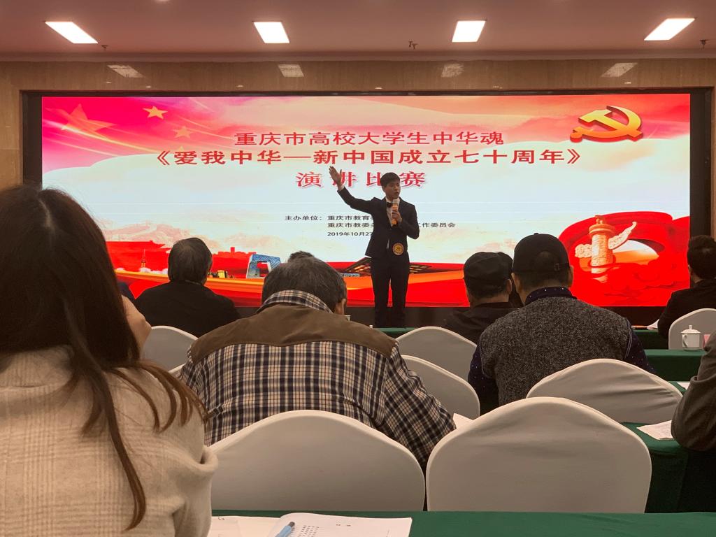 10月27日,2019年重庆市大学生“中华魂”《爱我中华——新中国成立七十周年》主题教育读书活动演讲比赛在重庆考试院举行。此次活动由重庆市教育委员会、重庆市教委关心下一代工作委员会主办。重庆市关工委副主任刘丽俐、市关工委秘书长韩国涛、市关工委办公室主任雷雯霖;重庆市委教育工委委员、市教委副巡视员、市教委关工委主任帅逊,市教委关工委常务副主任邓朝喜,市教委离退休人员工作处处长、市教委关工委副主任蔡理等参加赛事活动。