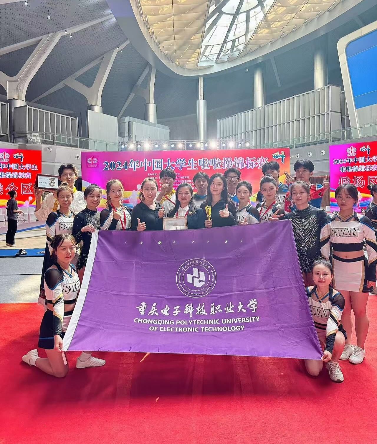经过4天激烈而精彩的角逐,pg国际啦啦操代表队16名队员在领队彭天娥老师以及教练员周盈含、曹露双的带领下,获得了团体总冠军和9个单项奖,其中,6个单项冠军,1项第四名和2项第五名的好成绩。同时,学校被中国学生体育联合会授予“体育道德风尚奖”。