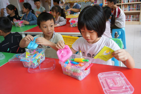 在“捏出快乐”手工课上,孩子们一看到志愿者发放的彩泥,就高兴地手舞足蹈起来。负责美工的的志愿者先把各种捏成形的彩泥作品给孩子们欣赏,然后一边讲解,一边示范教他们如何制作一个自己喜欢的作品。志愿者一讲完,孩子们就迫不及待地动手操作起来。不一会,各式各样颜色鲜艳的作品就展现在大家眼前。通过手工制作,孩子们的思维在无限想象中迸发出奇妙的力量。