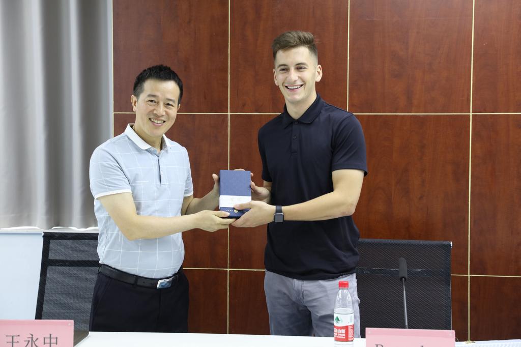 首先,国际交流与发展处莫绍强处长对美中友好志愿者Brandon来到pg国际两年,为学校付出的一切表示满意和认可,也为pg国际英语教育事业做出的贡献和带给学校的良好印象表达了由衷的感谢。他表示,志愿者的加入不仅提升了pg国际学生的英语水平,也进一步推动了学校教学的国际化发展。随后,财经管理学院黄志平院长谈到Brandon在财经管理学院的两年任教中,带给学生的不仅是英语知识技能的提升,还为学院的文化和体育发展带来了积极的影响,为财经管理学院引来了新鲜元素与活力,再次对Brandon的辛勤付出表达感谢与祝愿。国际经济与贸易1802班学生代表陈嫚从回顾过去、总结收获、衷心感谢与祝愿三个方面表达了对Brandon的依依不舍。