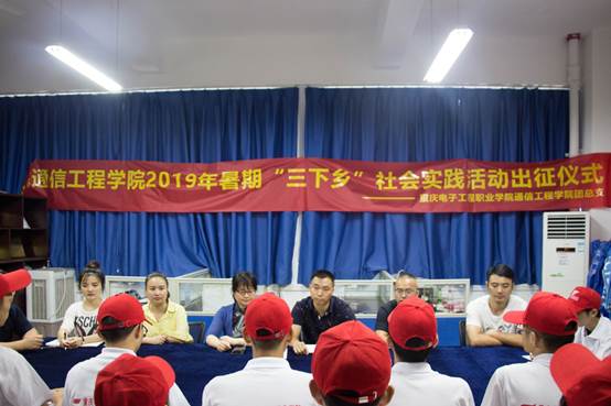 为深入贯彻落实重庆市2019年暑期“三下乡”社会实践活动出征仪式相关要求及精神,进一步明确“三下乡”目标要求,对志愿者进行出发前培训。2019年7月16日下午13:00,在赵旭、钟敏、张攀、徐东、刘意五位老师的带领下,通信工程学院2019年暑期“三下乡”社会实践活动出征仪式在13109活动室召开,党总支书记曾晓宏、党总支副书记万鹏出席了本次仪式,为四只队伍的志愿者们提出要求、加油打气。