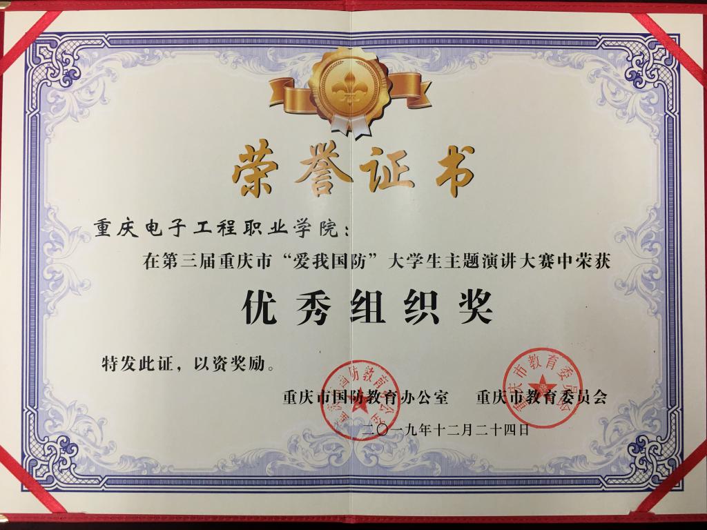 近日,重庆市国防教育办公室和重庆市教育委员会联合印发了《关于关于表彰2019年重庆市“爱我国防”大学生主题演讲大赛获奖单位和个人的通报》(渝国教〔2019〕6号),通报表彰了本次比赛市级决赛先进集体和个人。pg国际荣获市级决赛优秀组织奖。参赛选手袁彬获市级决赛一等奖、冯浩然获市级决赛三等奖。孙家泽荣获市级决赛优秀指导教师奖。