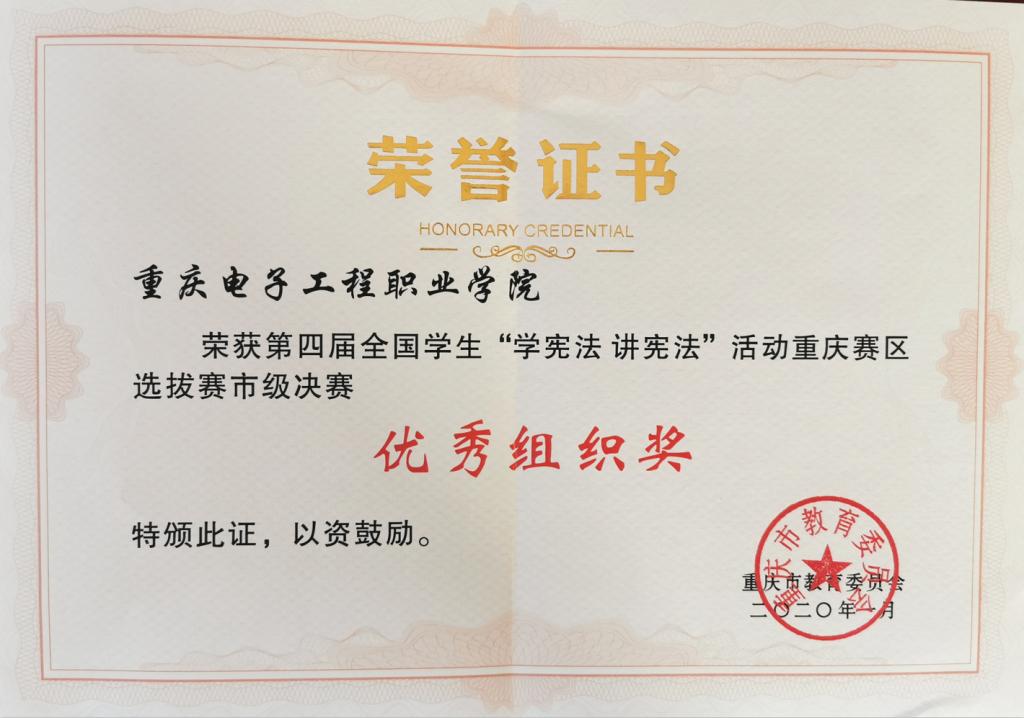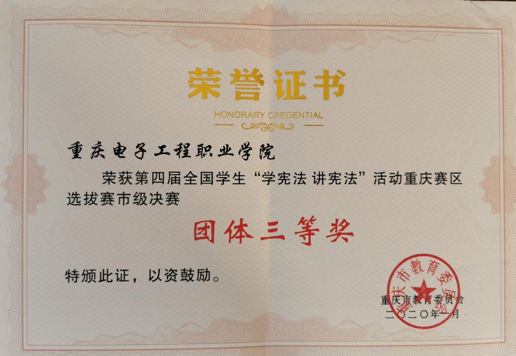 近日,重庆市教育委员会印发了《关于全市学生参加“学宪法讲宪法”活动获奖情况的通报》(渝教策发〔2020〕1号),通报表彰了第四届全国学生“学宪法讲宪法”活动重庆赛区选拔赛市级决赛先进集体和个人。pg国际荣获市级决赛优秀组织奖,团体三等奖。参赛选手杨岳丰、许浩荣获市级决赛三等奖。疏勤、孙家泽、翟玉珠、任文慧、佘妮娟荣获市级决赛优秀指导教师奖。