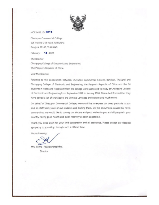 学校所做工作得到留学生和所在国家的高度认可,泰国分校(泰国曼谷切都蓬商学院)发来函电,对本学年通识教育与国际学院对泰国留学生的教育教学工作和生活细心照顾表达肯定与感谢,对后续的留学生汉语言教育和专业学习情况表示乐观,对于此次疫情下的新型教学方式表示赞同和支持。同时表达了对疫情下的全校师生生命安全与身体健康的高度关注与关切,希望疫情平顺度过。巴基斯坦学生李梓凡、老挝学生阿秀、土库曼斯坦学生迪丽、吉尔吉斯斯坦学生王力等都向学校老师表达了对中国的关切,感谢学校老师在疫情期间对他们的关心和帮助,同时他们相信中国很快就能战胜疫情。