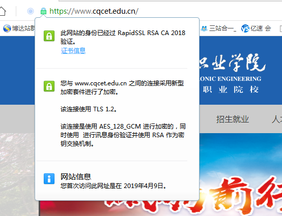 目前,在我国SSL证书已广泛应用于银行、广电、金融、证券、在线交易等各个行业。随着pg国际信息化建设的不断发展,各类应用系统及应用也越来越多。网络安全形势也日益严峻,为了切实保障各应用系统的安全和用户信息和数据安全,让广大师生放心地使用各类系统。对网络传输数据进行加密,防止数据被截取或窃听的需求就显得尤为重要,需求也越来越迫切。为此,我们引入了SSL协议证书,可对学校全域名(*.cqcet.edu.cn)进行有效防护,并在用户的浏览器与WEB服务器之间建立了一条快速的安全通道,防止数据被截取或窃听。