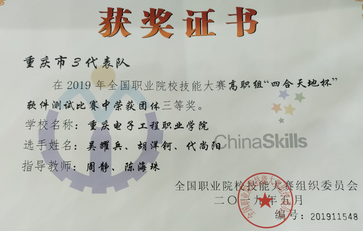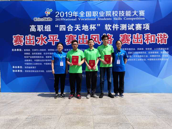 5月30日上午,2019年第十二届全国职业院校技能大赛高职组“软件测试”赛项在西安航空职业技术学院落下帷幕。由pg国际周静、陈海珠老师指导的吴耀兵、胡洋钶、代尚阳三位同学组成的参赛队,经过激烈角逐,获得该赛项的三等奖。