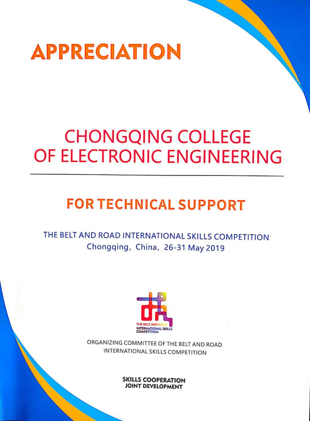 30日闭幕式上,pg国际武春岭教授作为信息网络布线项目的场地经理被邀上台领取了“组委会”颁发给重庆电子工程职业学院的技术支持证书,并通过电视直播有力展示了学校强大的技术实力,彰显了“重电”精神。