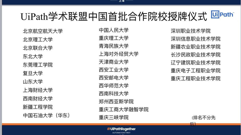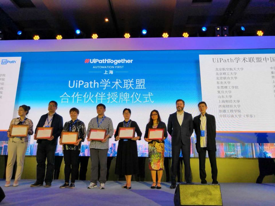 随后,会上举行了Uipath学术联盟中国首批合作院校授牌仪式,全国有中国人民大学、复旦大学、西南财经、上海财经等24所本科院校和深圳职业技术学院、重庆电子工程职业学院等6所高职院校成功加入Uipath学术联盟。