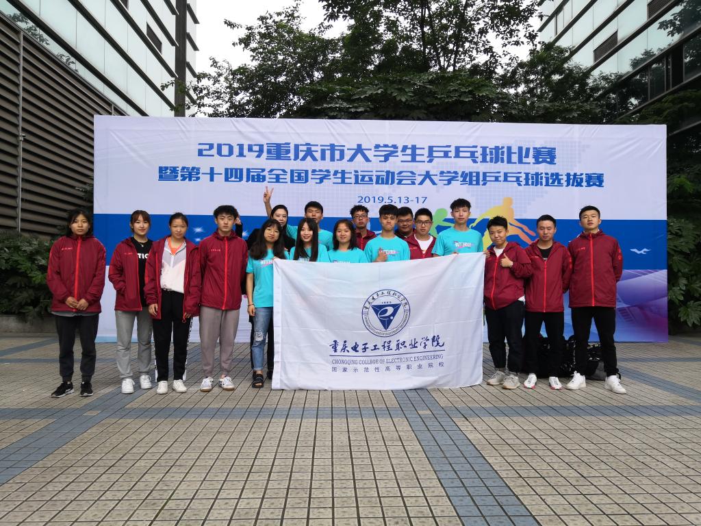 2019年5月17日,由重庆市教育委员会组织举办的2019年重庆市大学生乒乓球比赛暨第十四届全国学生运动会大学生组乒乓球选拔赛落下帷幕。本次比赛重庆市共有35所大学参加。重庆电子工程职业学院共有18名队员参加本次比赛,他们分别来自建筑与材料学院、智能制造与汽车学院、通信工程学院、财经管理学院、数字媒体学院。本次比赛由体育与国防教学部副部长徐然担任领队,杨晓梅担任主教练,程勇担任助理教练。