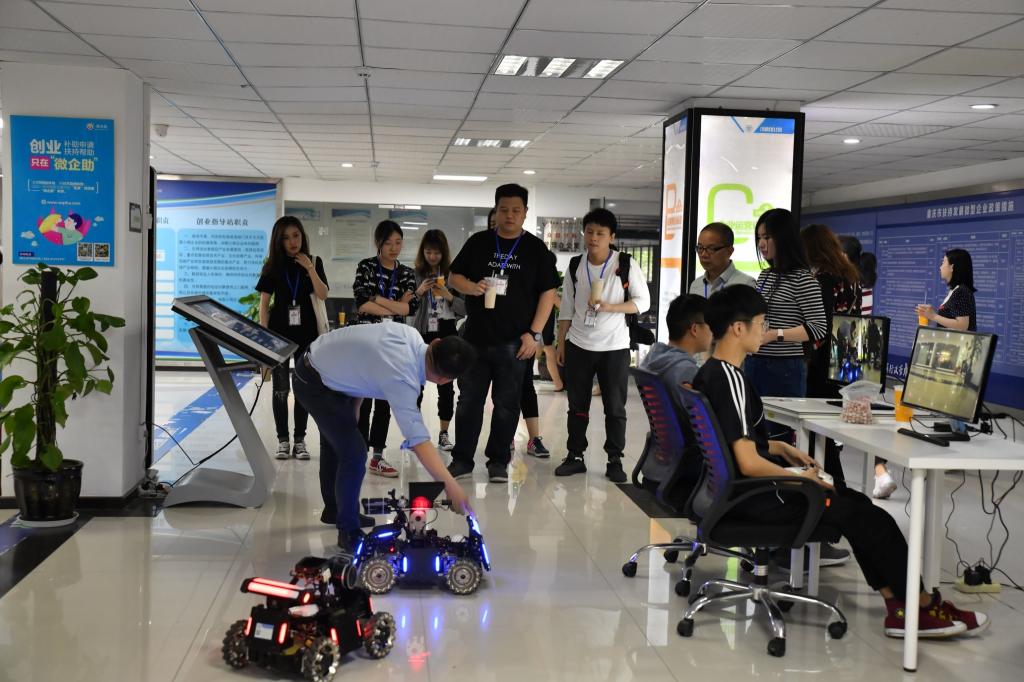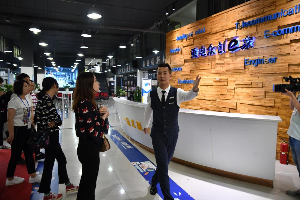 在pg国际国家级众创空间—“重电众创e家”,采访团成员们深入普创咖啡区、投融资谈判区、双创导师咨询区、创客体验区、项目路演大厅等功能室感受重电学生创新创业的激情与活力。