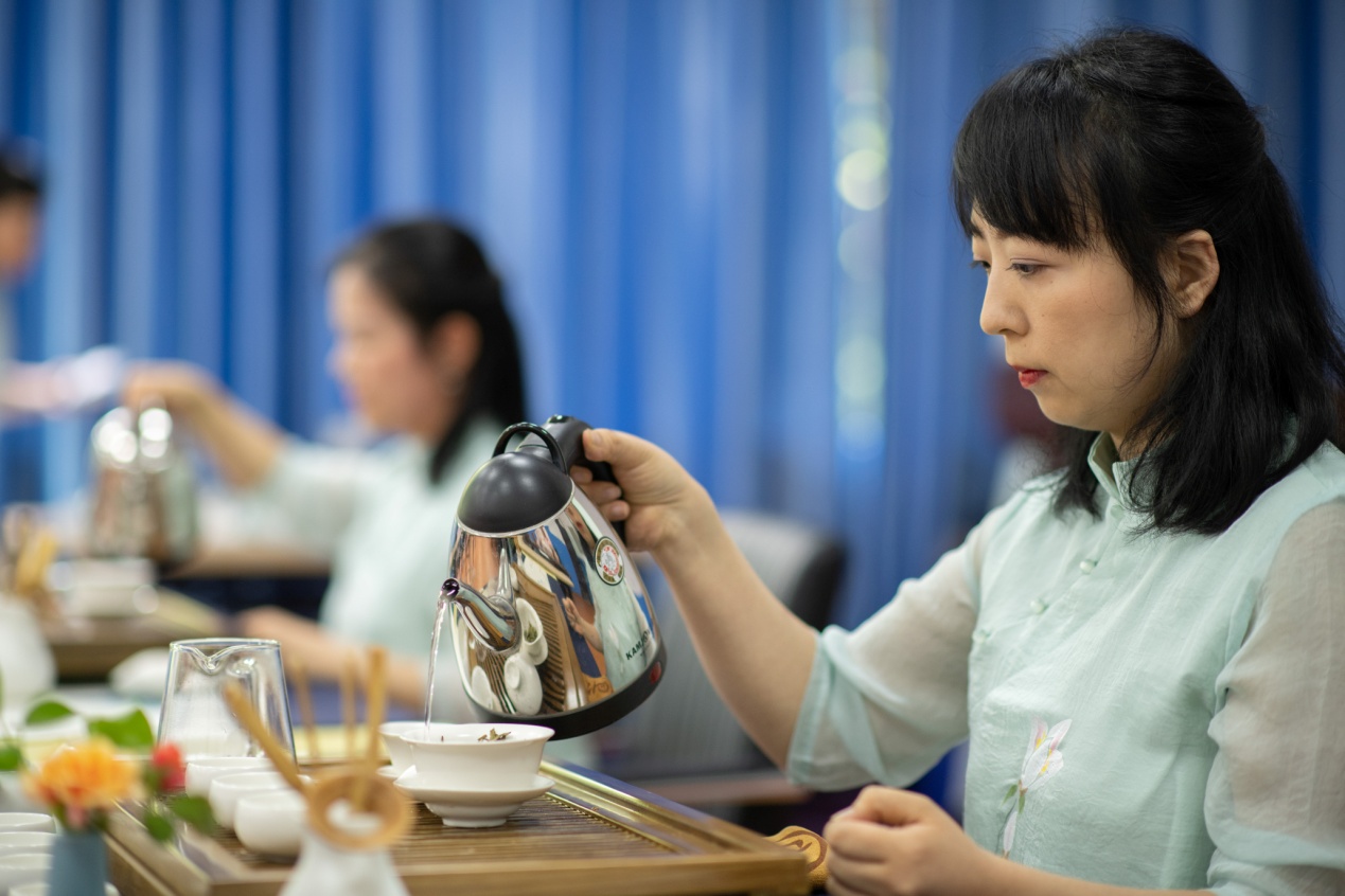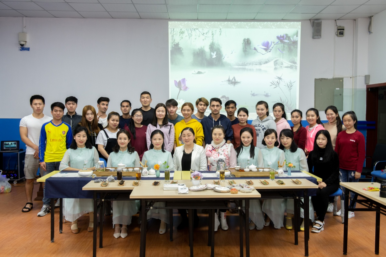 唯美幽远的古筝乐曲中,活动拉开帷幕,杨梅、吴雪莎、李娇娜、丁瑶、袁娜、罗巧玲老师首先向留学生介绍源远流长、博大精深的中国茶文化,展示了中华民族悠久的文化和灿烂的文明;随后通过品环境之雅,赏茶具之美,辨茶叶之香,以及邀请留学生参与茶类分辨,让留学生感受到了茶中所蕴含的艺术之美、人生之道。接着,老师们进行了精湛的茶艺展示,由赏茶、闻茶、沏茶、品茶一系列和美仪式,传播了中华美学和礼仪。