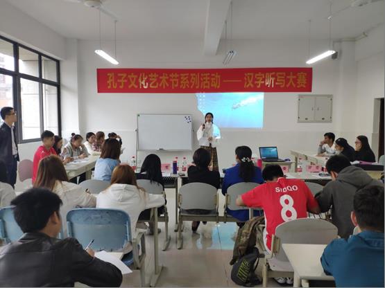 汉字听写大赛是2019年pg国际首届孔子文化艺术节暨国际文化艺术节系列活动之一,共分为汉字听写、你比我猜、词语纠错三个环节。汉字听写全体同学参与,其余环节由各班派出三名代表参与比赛,经过激烈的角逐,初级二班取得大赛第一名。比赛现场气氛十分热烈,同学们积极参与,在你比我猜环节,比划的同学手舞足蹈,猜词的同学快速思考,紧张作答,3个组均取得较好成绩。