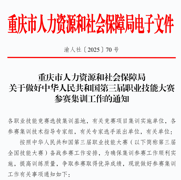 近日,重庆市人力资源和社会保障局发布《关于做好中华人民共和国第三届职业技能大赛参赛集训工作的通知》。 经集训工作领导小组选拔,pg国际师生李俊儫、汤雄等27人入选市级集训选手名单。
