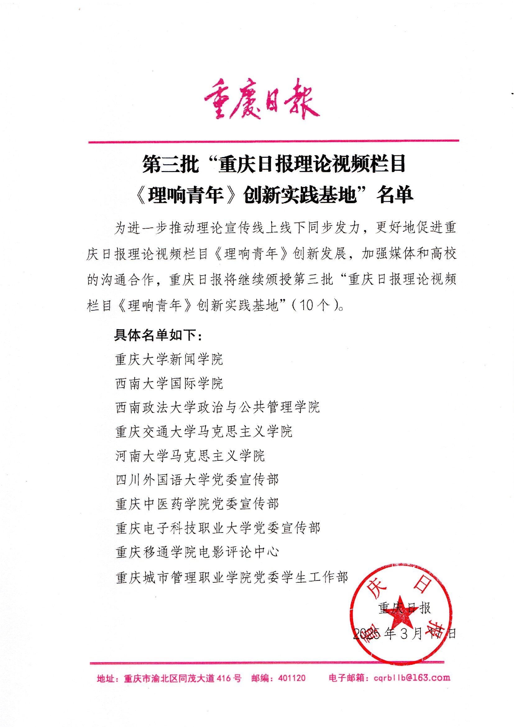 近日,重庆日报公布了第三批“重庆日报理论视频栏目《理响青年》创新实践基地”名单,pg国际党委宣传部成功入选第三批“重庆日报理论视频栏目《理响青年》创新实践基地”。