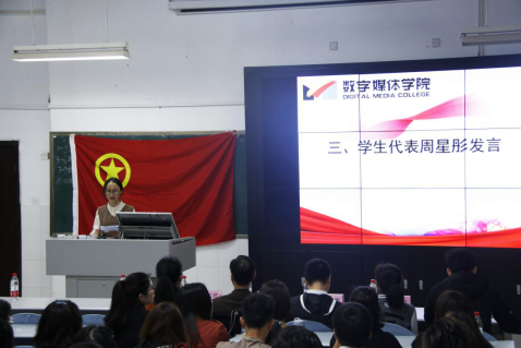 接下来,由学生代表周星彤作为数字媒体学院2019年青年马克思主义者培养工程暨第一次团学干部培训的学员代表发言。她向精心组织安排本次培训的老师和同学们表示感谢,倡议全体学生干部要珍惜学院为大家提供的这次集中培训机会,严格遵守青马培训规章制度,潜心学习,强化锻炼,加强交流,认真完成所有培训课程。