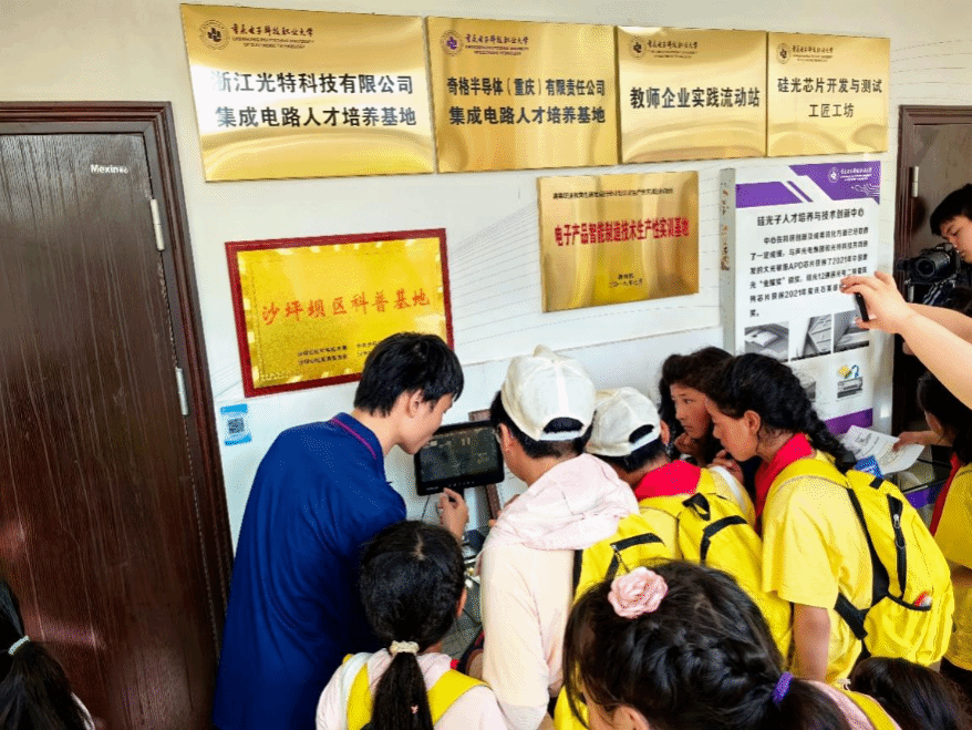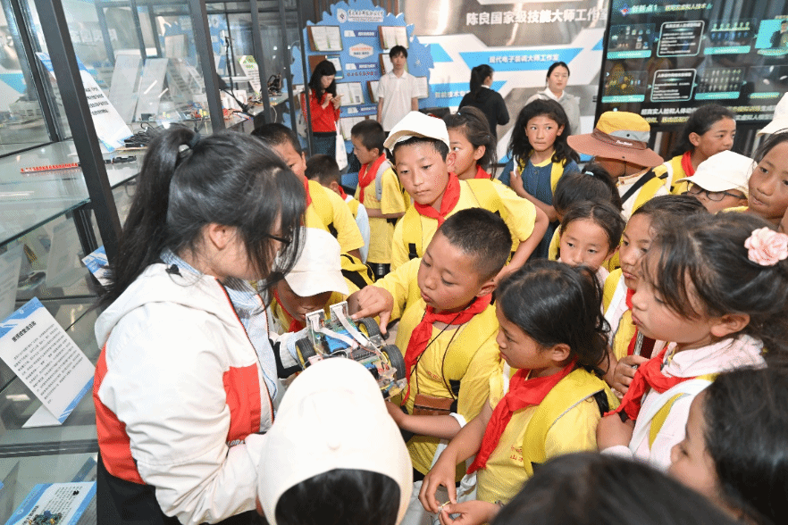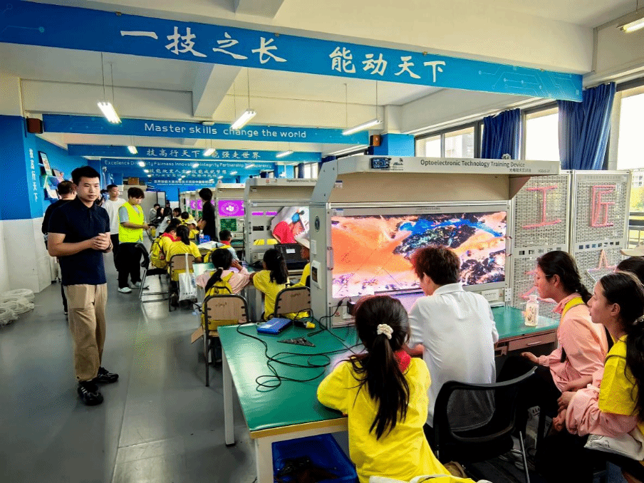 在陈良国家级技能大师工作室,双创国赛获奖学生引领芒康师生参观智能控制、光电技术等前沿领域的学生科研佳作,其创意令芒康学子们惊叹,其讲解激发芒康学子们创新思维,大小学生们交流热烈;在硅光子中心,工坊学生以“解码芯片产业的发展长卷:追溯往昔,展望未来” 为主题,通过演示和实物介绍我国芯片产业发展历程,让芒康学子们体会到 “科技报国” 责任;在世界技能大赛光电赛项中国主基地,金牌得主李小松老师讲述夺冠历程,集训队大学生分工位指导和展示光电技术赛项核心技能,以熏陶工匠精神,体验光电技术设计制作,赢得大家热烈掌声。