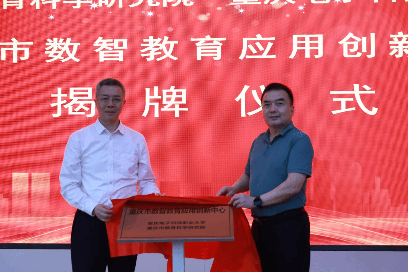 校长聂强与重庆市教育科学研究院院长蔡其勇共同为“重庆市数智教育应用创新中心”揭牌。