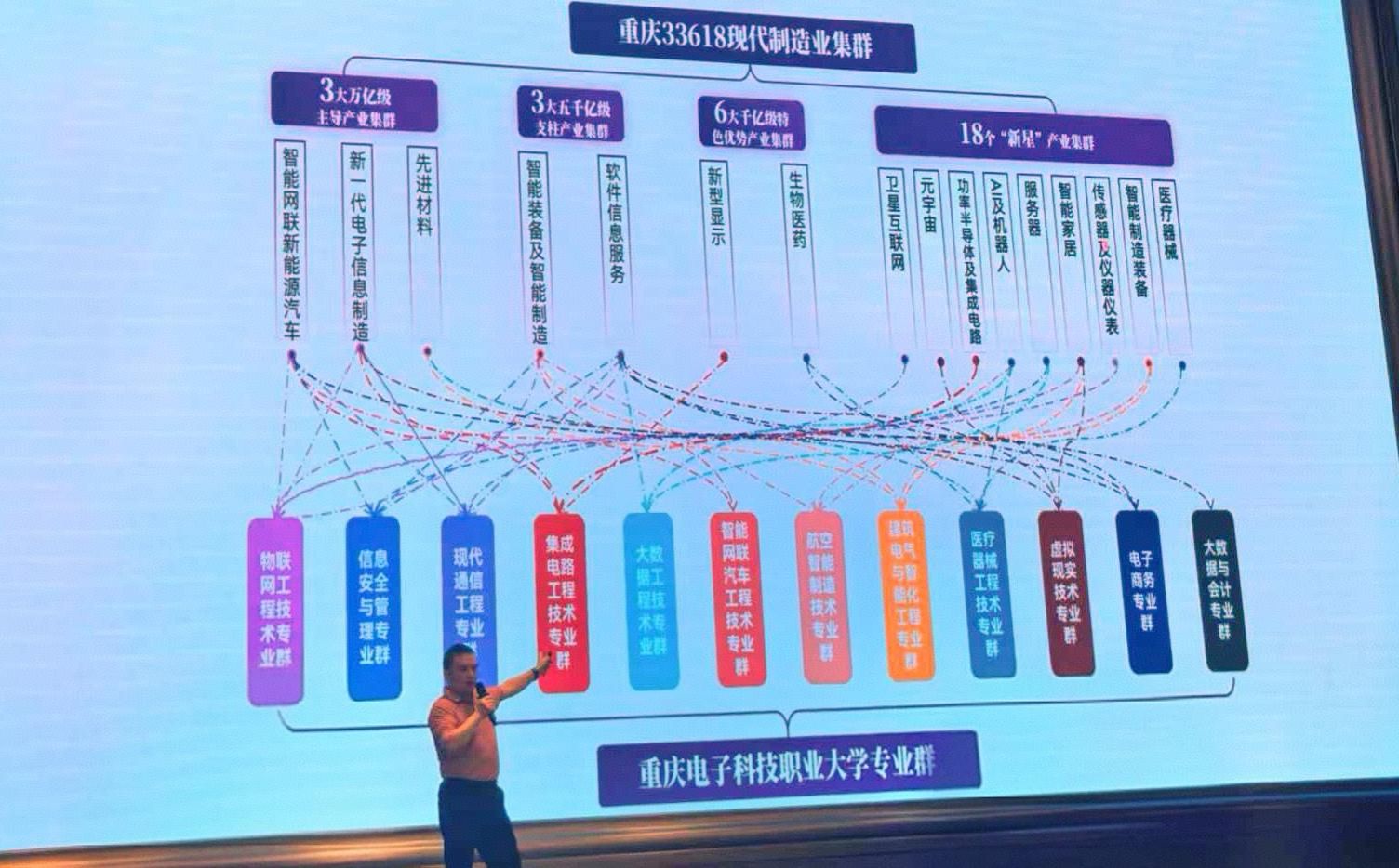 学校党委副书记、校长聂强受邀参加研讨会并作了“第二期‘双高’建设背景下职业教育‘五金’建设的思考与实践”的主题报告。聂强以建设教育强国的时代背景,面向教育科技人才一体化发展的全局性谋划,以紧抓国家推进第二期“双高建设”的战略机遇期,向大会分享了学校围绕重庆“33618”现代制造业集群体系“以群建院”、校企协同重构“岗位导向、通专融合、个性化培养”的“平台+模块”专业群课程体系、校企双师协同打造“金课堂”、对接产教资源打造金师金地金教材等建设经验,以学校中长期发展使命与愿景为引领取得的跨越式发展成就,报告引起了与会人员高度认可与强烈共鸣,有效促进成渝地区双城经济圈与京津冀地区职业教育深度交流与共识凝聚。