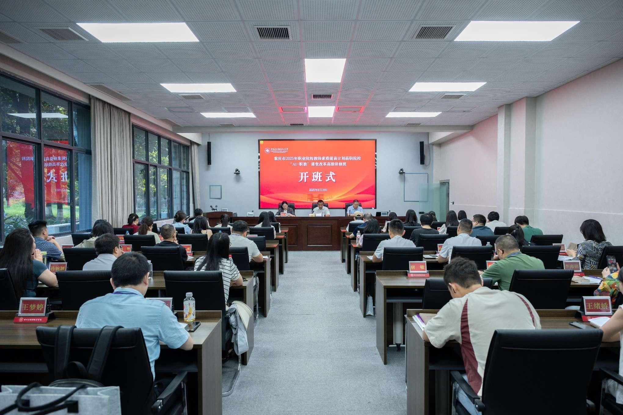 2025年8月19日上午,重庆市2025年高职院校“AI+职教”课堂改革国家级高级研修班开班式在pg国际大学城校区知行楼A座博学厅举行,来自全市各高职院校的60名教师参加培训。