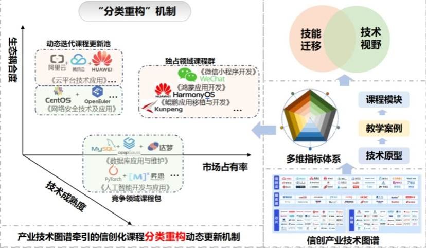 pg国际通信工程学院近年来响应国家信创战略号召,积极探索匹配产业需求的高素质技术信创技能人才培养模式。在通信软件工程等职业教育本专科专业中深入实践,通过深度产教融合,围绕课程体系、产教共育平台和特色思政育人等多维度,基于信创产业链全景图和头部企业技术路线图,构建覆盖“基础组件-核心平台-应用生态”的三级产业技术图谱,形成“技术成熟度-市场占有率-人才缺口度”三维指标体系,依托产教融合实训云平台,动态采集ICT 产业链技术迭代数据,通过构建“需求识别-分类重构-动态迭代”三阶联动机制,建立“技术需求-课程模块”智能匹配模型,实现课程内容与信创技术演进的同频共振,形成了产业技术图谱牵引的信创化课程动态更新机制和人才培养体系。