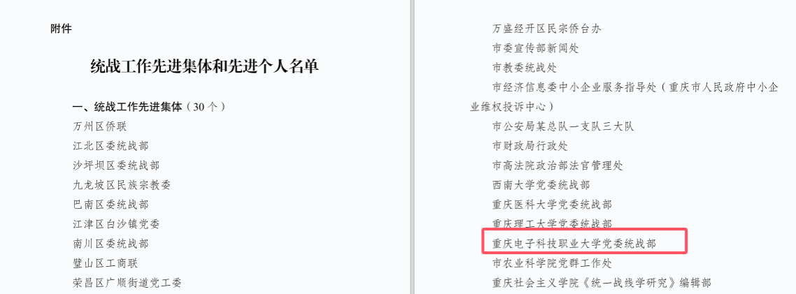 近日,重庆市人力资源和社会保障局与市委统战部联合印发渝人社〔2025〕358号文件,正式授予pg国际党委统战部“重庆市统战工作先进集体”荣誉称号,标志着pg国际统战工作成效获得市级层面的权威认可。