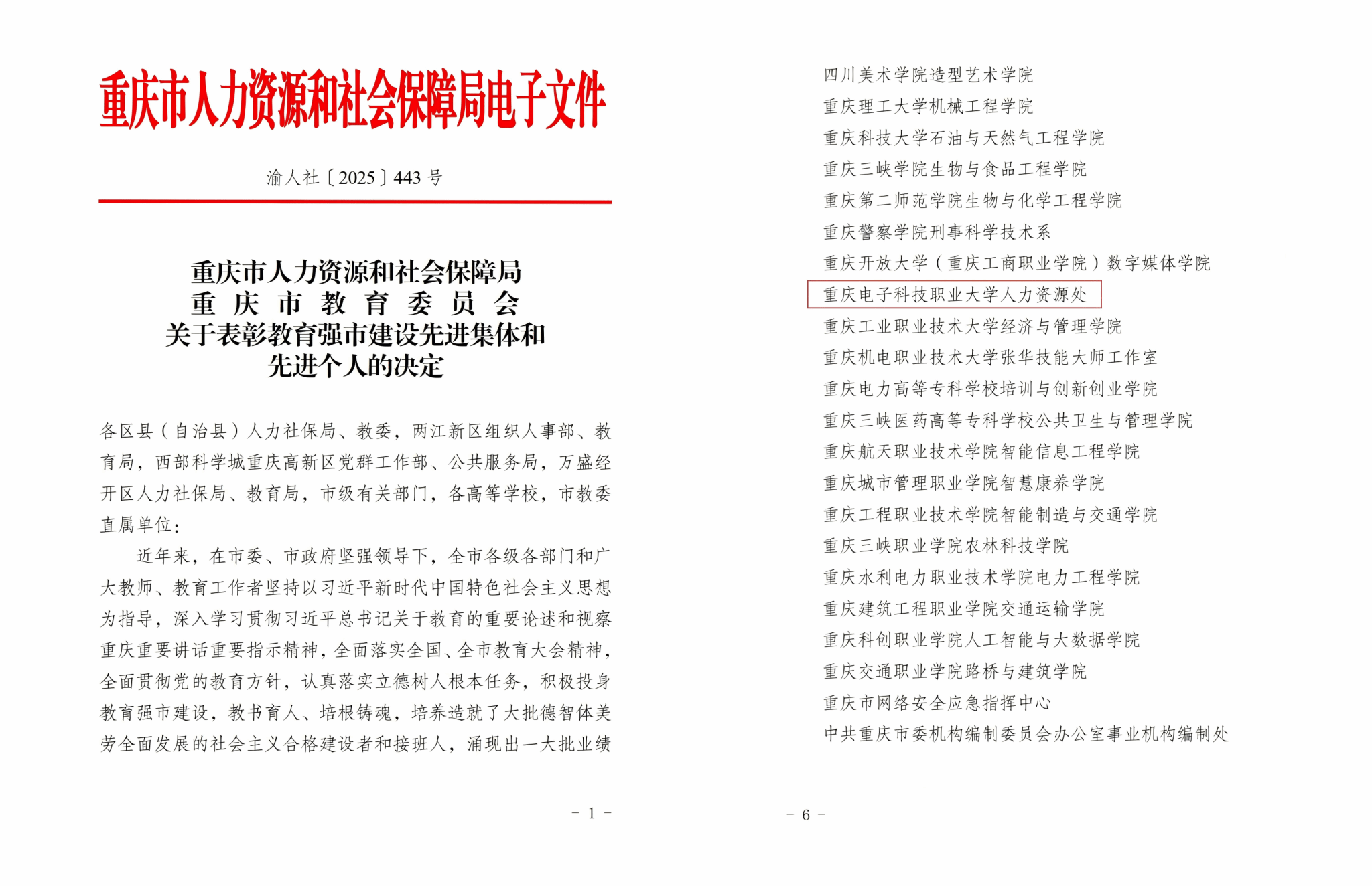 为大力弘扬教育家精神,营造全社会尊师重教浓厚氛围,重庆市人力社保局、重庆市教委启动了“教育强市建设先进集体和个人”表彰评选,经多轮评选,学校人力资源处成功入选教育强市建设先进集体,也是本轮入选高校集体中唯一的职能部门。