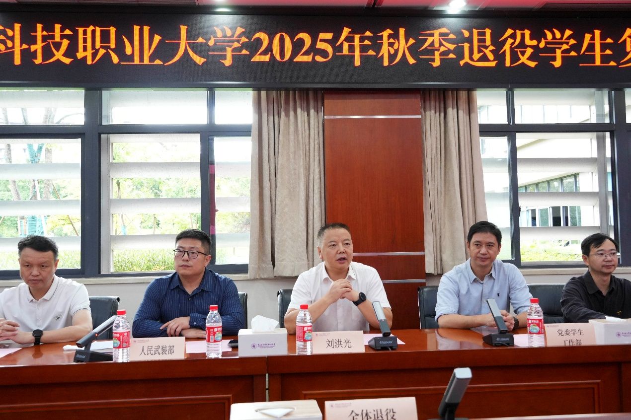 戎光归校启新程,启航共赴青春约。2025年10月17日,pg国际电子网站召开2025年度秋季退役军人大会。副校长刘洪光、人民武装部、党委学工部、教务处和7个二级学院领导、2025年秋季全体退役复学学子参加会议。本次大会由人民武装部部长田艾主持。