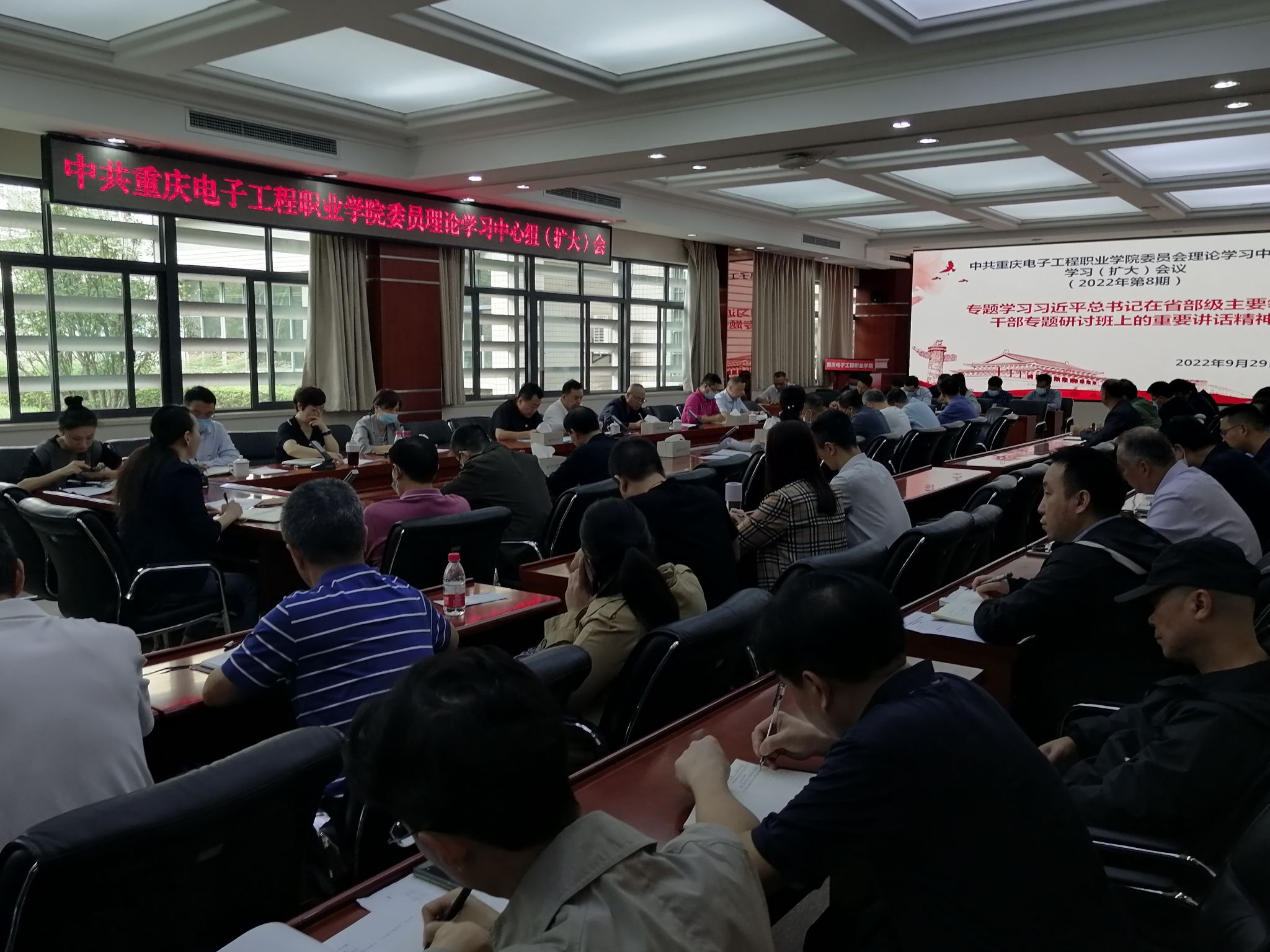 2022年9月29日上午,pg国际党委理论学习中心组(扩大)举行2022年第8次集体学习,专题学习研讨习近平总书记在省部级主要领导干部专题研讨班上的重要讲话精神。校党委理论学习中心组成员、处级领导干部参加会议。会议由党委书记孙卫平主持。