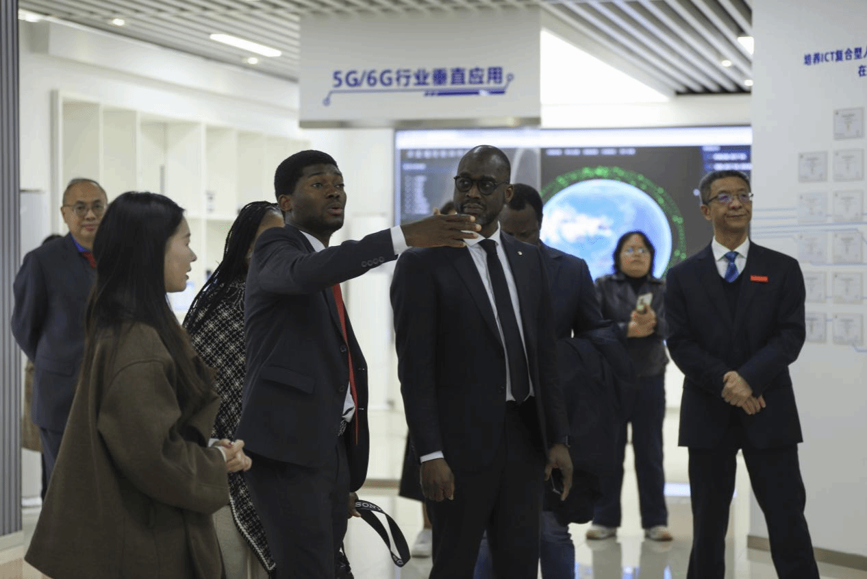 在学校领导的陪同下,阿贾巴大使一行先后参观了校史陈列展览馆、人工智能与大数据学院、通信工程学院、电子与物联网学院及国学馆等。每到一处,参观点负责人都详细介绍了相关领域的办学特色、师资力量、科研成果及人才培养情况。大使阁下认真聆听讲解,不时驻足询问,对学校在电子信息、智能技术等领域的专业优势和育人成效给予高度评价,尤其对学校将产业需求与人才培养紧密结合的职业教育模式表示赞赏。