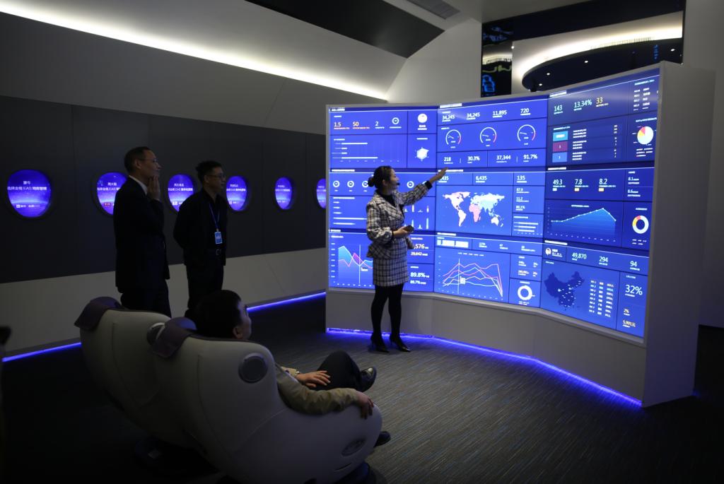 随后,大家来到云之家产品实验室大数据展览屏前,在讲解员的带领下逐一了解了云之家大数据的智能应用以及数据分析能力。在赛艇划船机旁,宋立超校友与聂强校长现场进行了200米赛道的赛艇划船PK,在轻松愉悦的氛围中体验了企业的运动文化。