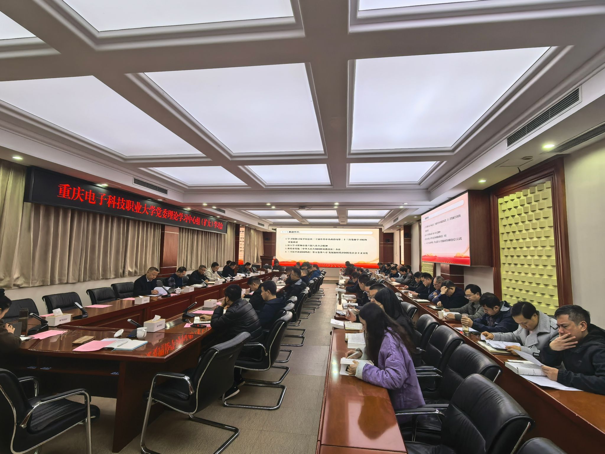 会议跟进学习了习近平总书记在二十届中共中央政治局第二十三次集体学习时的重要讲话精神、市委六届八次全会精神、重庆市实施《中华人民共和国职业教育法》办法,以及《习近平谈治国理政》第五卷中《发展新时代中国特色社会主义文化》相关论述。集中学习了习近平总书记《求是》杂志重要文章《推进党的自我革命要做到“五个进一步到位”》、《中国共产党章程》第七章《党的纪律》、《中国共产党廉洁自律准则》以及学校全面从严治党、学术规范、经费管理、采购招标、固定资产、师德师风、基本建设等8项校级规章制度。党委常委、党政办公室主任金琳、党委常委、党委教师工作部部长周鑫分别围绕“全面从严治党重点领域专项整治”和“教师思想政治和师德师风建设工作”作中心发言;科研与社会服务处处长沈雕、党委学工部部长江兵分别“围绕学校科研工作”和“以学风建设推动校园文化建设向上向好”作交流发言。