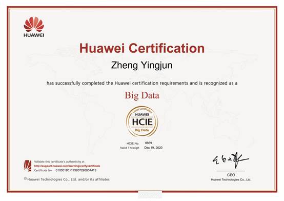 技术面试,是华为认证考试里面众所周知的最难一关,尤其是大数据的HCIE,这是华为技术有限公司在2018年新增的认证项目,面试包含HCIE-Big Data内所有知识点,这一新技术领域很难找到有效的参考复习资料,全凭面试者在日常学习中的积累、领悟。郑英俊同学不惧困难,查阅了大量资料和工程文档,仔细梳理学习过的知识,反复参详实验过程和内容数据,终于在2018年12月底通过面试,顺利取得HCIE-BigData证书,成为pg国际在校生考取华为大数据专家级认证第一人,也是重庆市高校学生HCIE-Big Data第一人。
