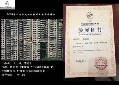 在2018年第18届平遥国际摄影大展中,pg国际数字媒体学院李韵老师带领并指导广播影视制作专业学生的两幅作品《山城,索道》和《堵?不堵?》,经过层层筛选,与来自35个国家和地区,102所顶级摄影院校和3268名国际摄影师的作品一起,入选此次平遥国际摄影大展,并被公开展示。这是pg国际学生作品首次入选国际一线专业展览赛事,同时,pg国际也是本次重庆市高校入选27幅作品中高职院校入选数量最多的学校(本科院校24幅,高职3幅)。