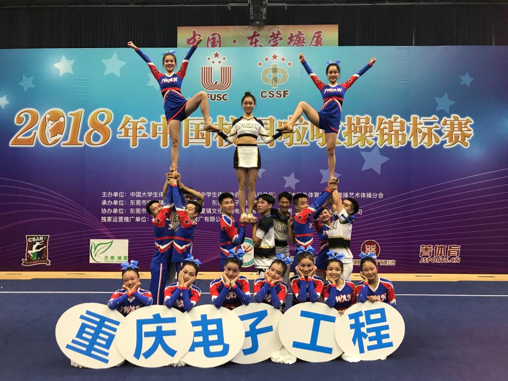 重庆电子工程职业学院啦啦操队成立于2008年,十年中,在校党委学工部、体育与国防教学部及各方的帮助与支持下,在主教练彭天娥老师的积极带领下,队员们刻苦训练,精益求精,队伍已逐渐走向成熟,并多次在全国大赛中取得佳绩。该队于2012年开始至今在全国各大国家级比赛中获得四个团体冠军及二十余个单项冠军。