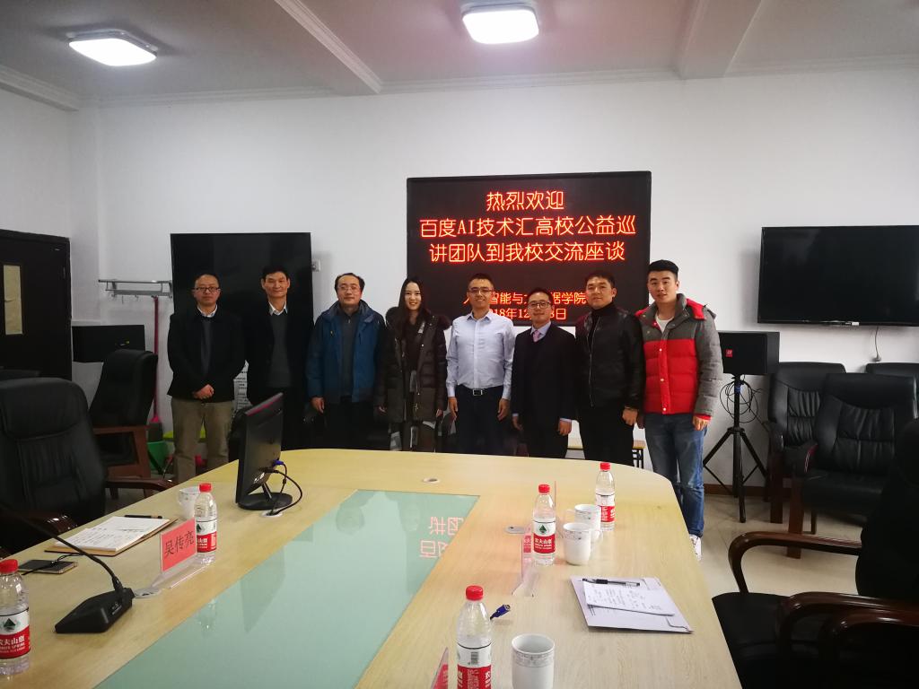 2018年12月18日上午,百度AI技术汇高校公益巡讲团队到pg国际召开了人工智能领域的校企合作交流座谈会。参加本次座谈会的领导和嘉宾有:人工智能与大数据学院副院长童世华、党总支副书记刘宏宇、百度校园品牌部经理马天野女士、国信蓝桥CT0张亮先生等,人工智能与大数据学院教师胡云冰、邓剑勋等参会交流。会议由人工智能与大数据学院朱堂勋老师主持。